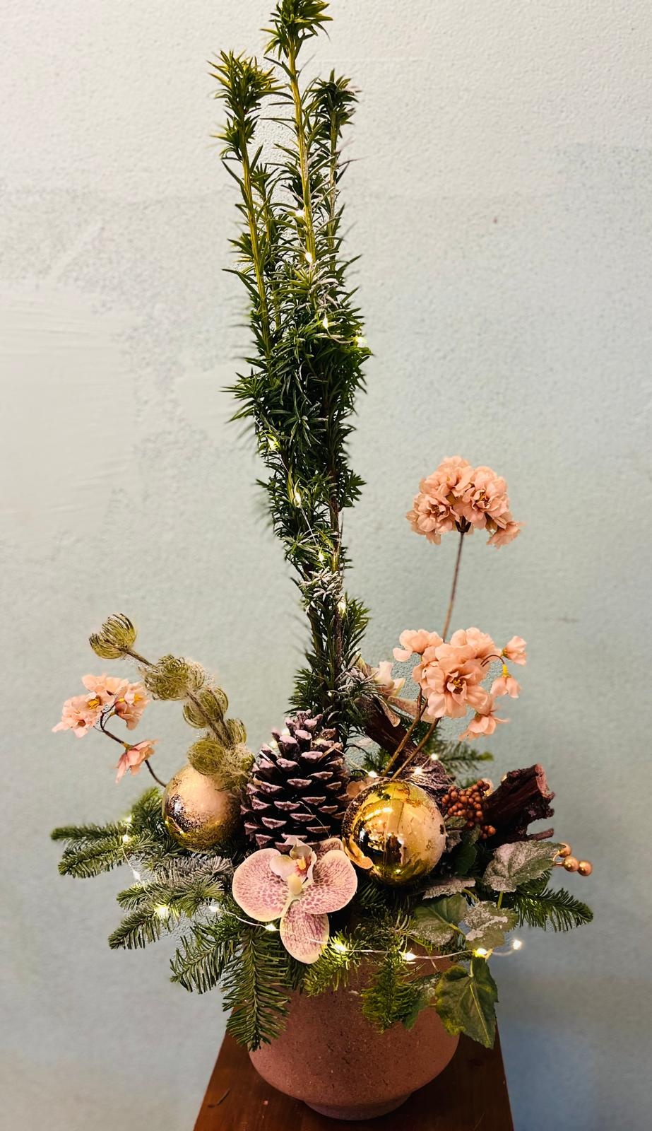 Dit hoge kerststuk met gouden kerstballen en een orchidee brengt de kerstsfeer terug in huis. Wij raden aan om dit prachtige exemplaar met kerstverlichting aan te schaffen. Maar uiteraard kan dit ook zonder.