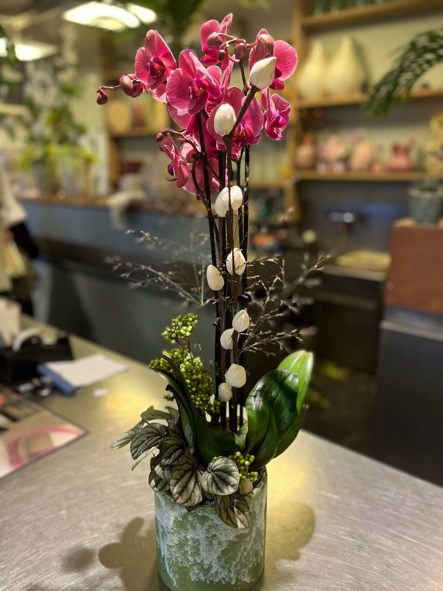 Stijlvol arrangement met een fuchsia orchidee, groene accenten en een elegante keramieken pot. Een kleurrijke eyecatcher voor elk interieur.