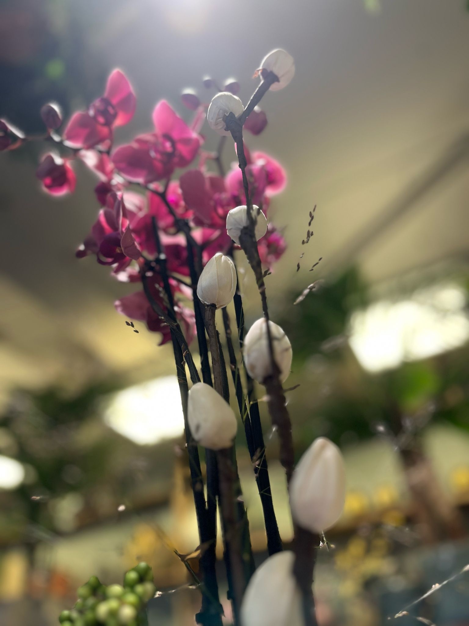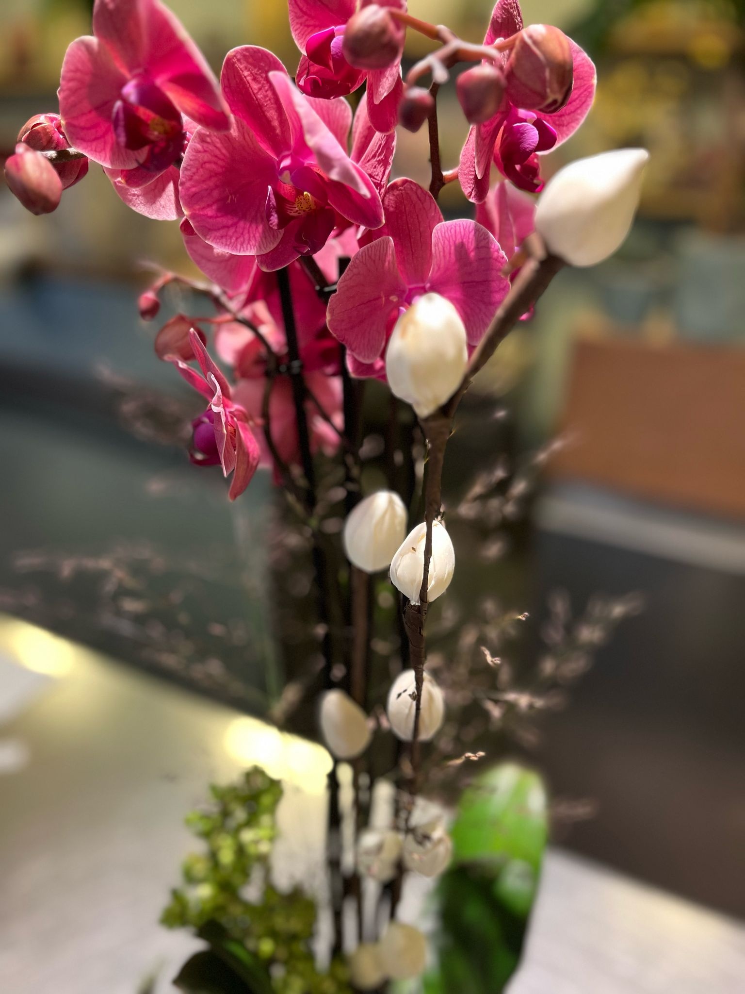 Breng kleur en elegantie in huis met deze prachtige fuchsia orchidee in een robuuste, groene keramieken pot. De levendige bloemen vormen een mooi contrast met de groene bladeren en speelse witte accenten. Het geheel straalt luxe uit en is perfect voor de woonkamer, keuken of kantoorruimte. De stevige pot met textuur geeft het arrangement extra karakter en zorgt voor stabiliteit. Ideaal als blikvanger of als stijlvol cadeau!
