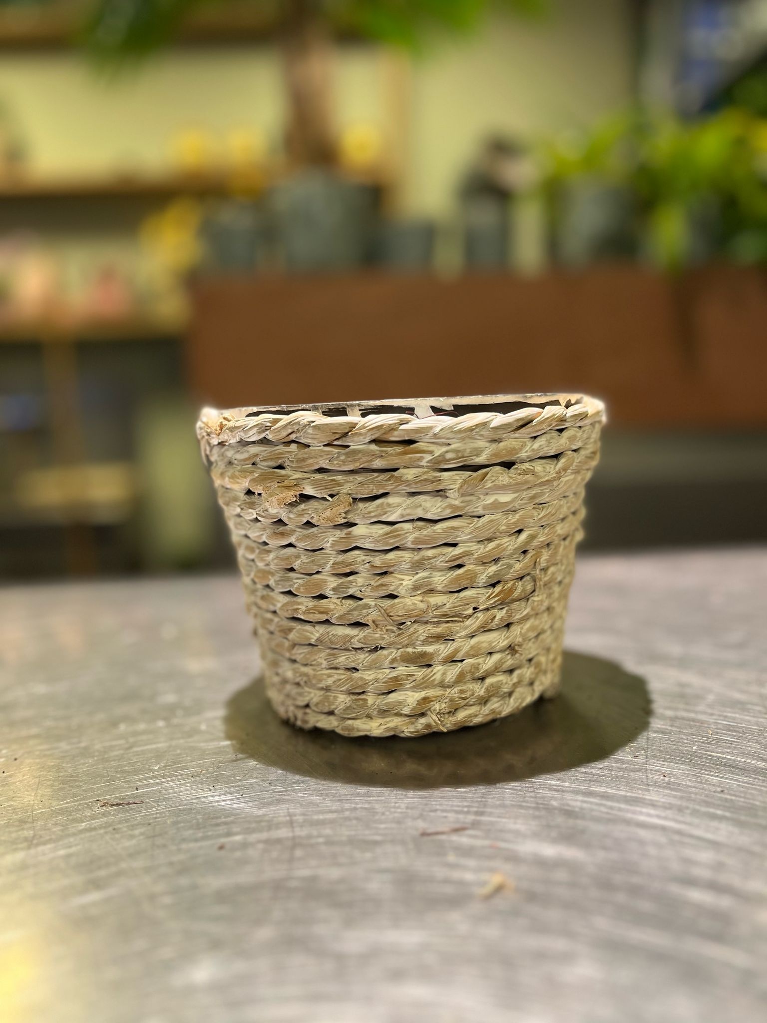 Stijlvolle gevlochten mand met natuurlijke uitstraling. Ideaal voor kamerplanten of als decoratieve opberger.