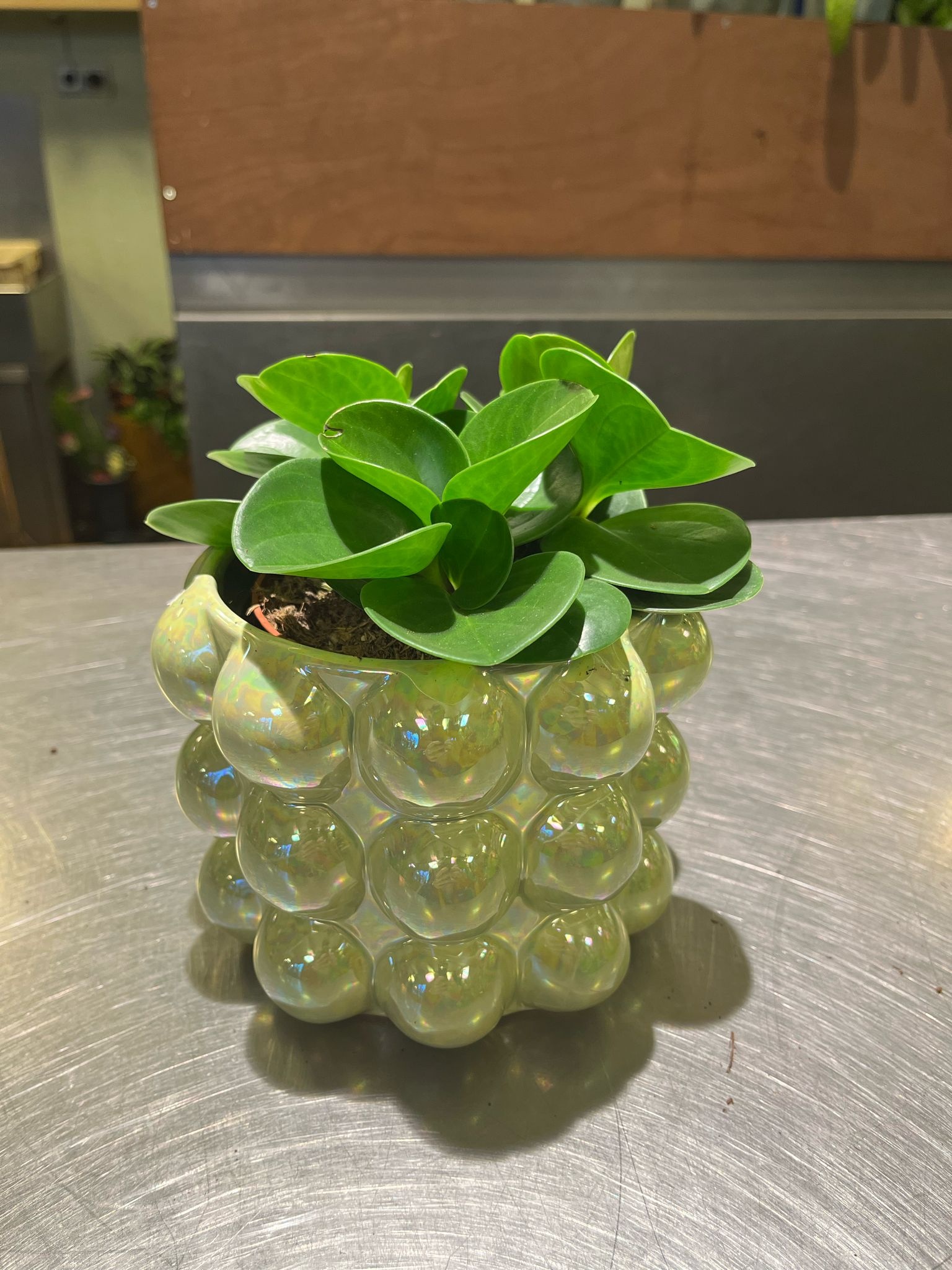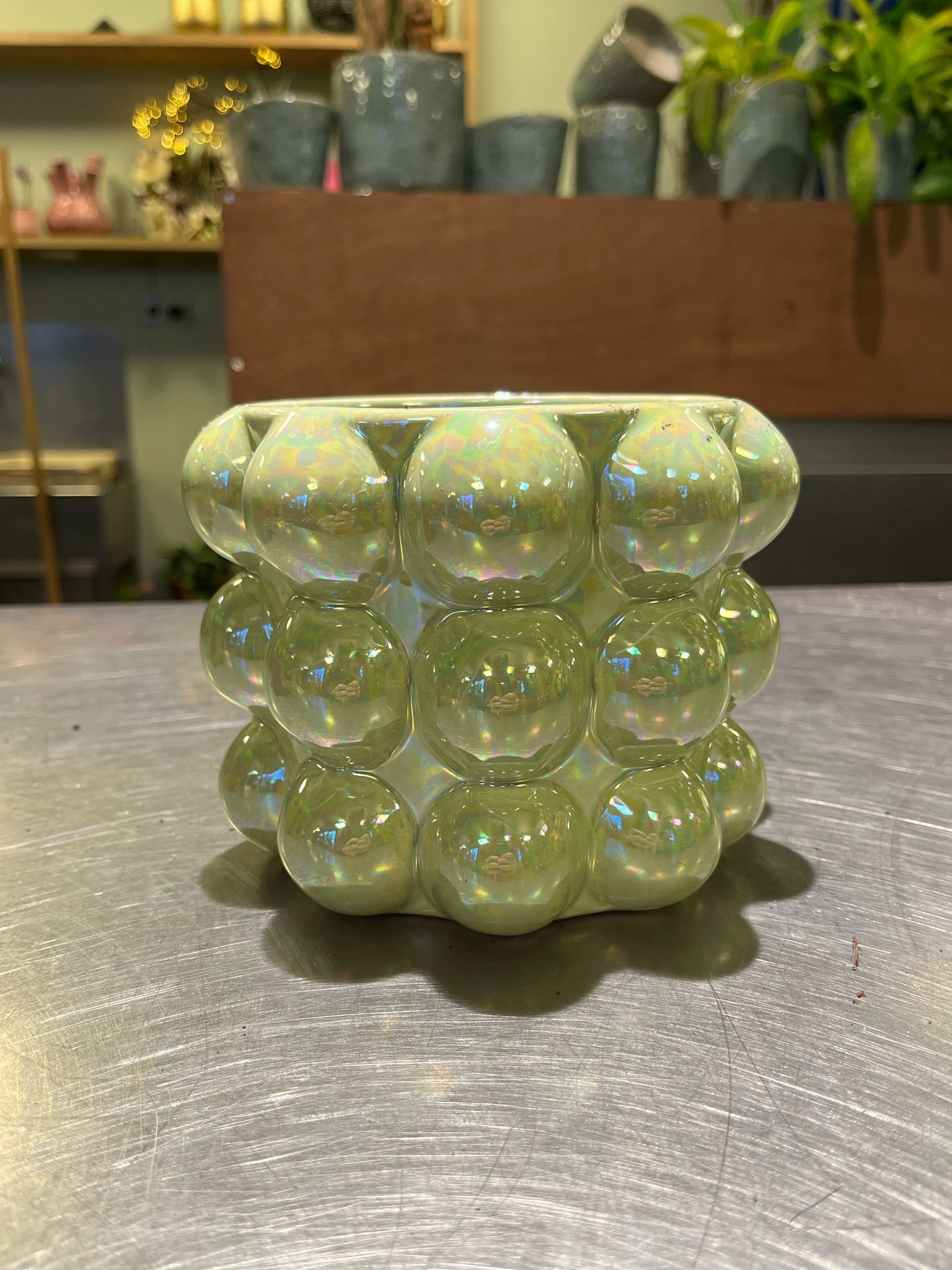 Stijlvolle glazen pot met speelse bubbeltjesstructuur. Perfect voor kleine planten of als decoratief item.