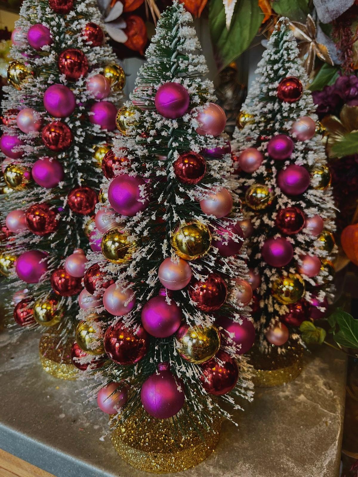 Deze feestelijke Glitter Kerstboompjes, versierd met roze, gouden en rode kerstballen en een laagje sneeuw, brengen sprankeling en kleur in elk kerstinterieur. Perfect voor op tafel of als sfeervol accent in huis.
