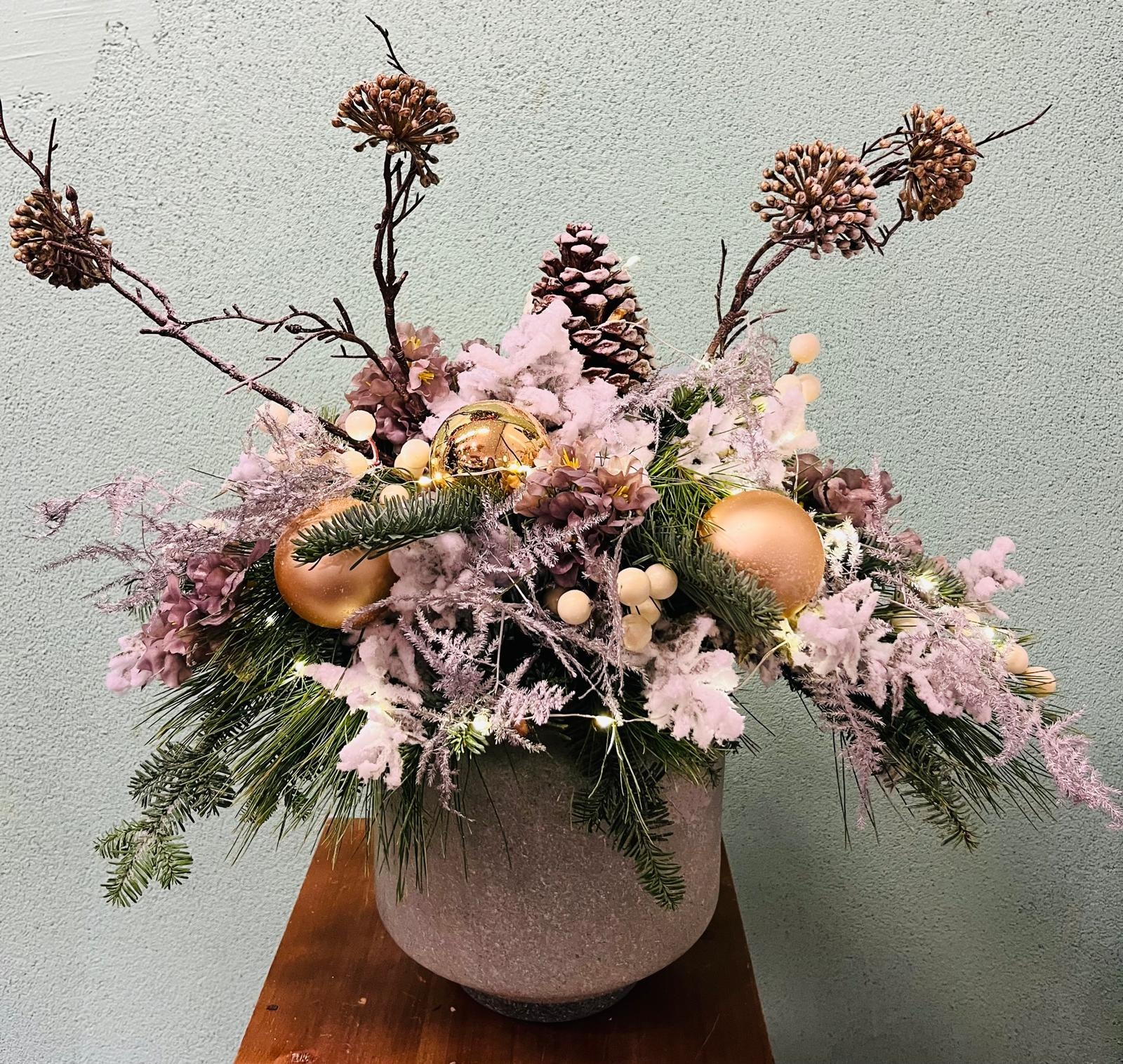 Dit prachtige arrangement brengt de kerstsfeer in ieder huis. De pot is een uniek exemplaar dat perfect past bij een kerststuk. Liever zonder lichtjes? Dat kan ook.
