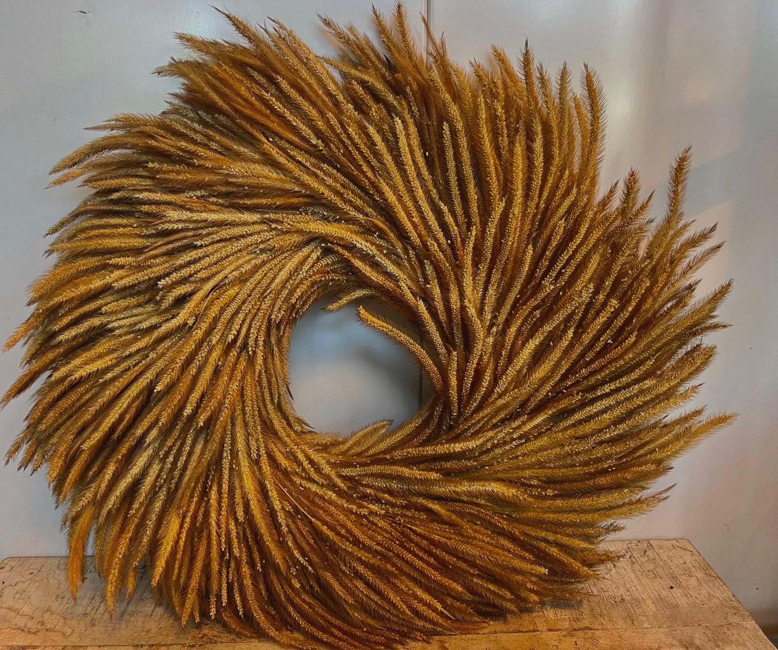 De Gouden Herfstkrans is een prachtig stuk dat de schoonheid van de herfst viert met zijn rijke, gouden tinten en dynamische golvende vorm. Deze krans is gemaakt van zorgvuldig geplaatste, natuurlijke aren die een vloeiende, bijna wervelende structuur creëren, wat hem een unieke en elegante uitstraling geeft. De warme gouden kleur voegt een gezellige sfeer toe en maakt deze krans perfect als decoratie voor de herfst, zowel binnen als buiten aan de deur of op een muur. Deze krans is ideaal voor liefhebbers van natuurlijke en minimalistische decoraties die toch een sterke visuele impact maken.