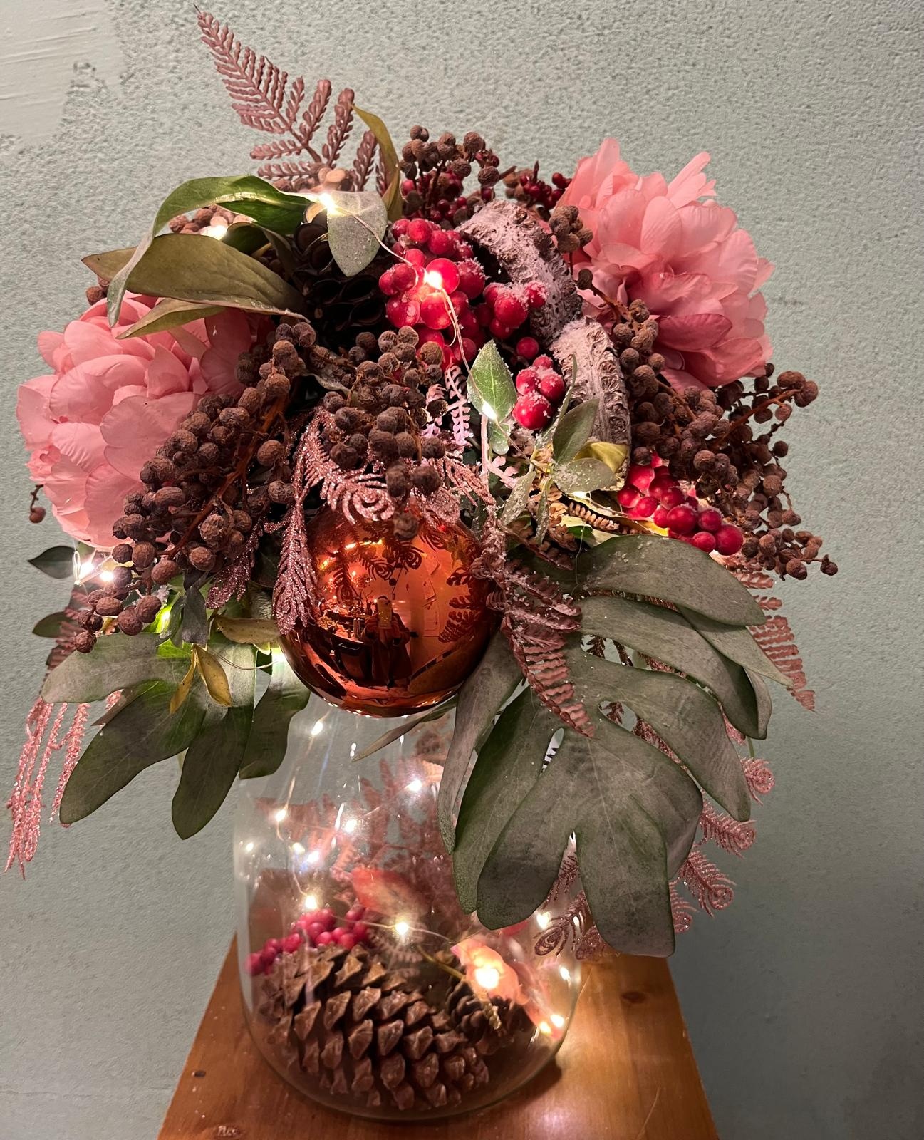 Dit kerststuk is gemaakt op een glazen vaas, waarin wij dennenappels hebben gelegd om de sfeer van buiten naar binnen te brengen. Liever zonder licht? Dat kan ook.