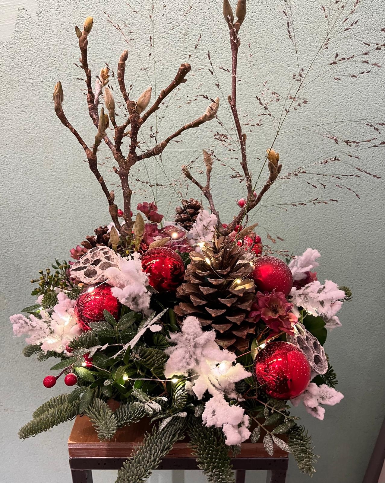 Dit kerststuk springt direct in het oog met haar opvallende rode tinten en hoge, uitstekende takjes. Liever zonder licht? Dat kan!