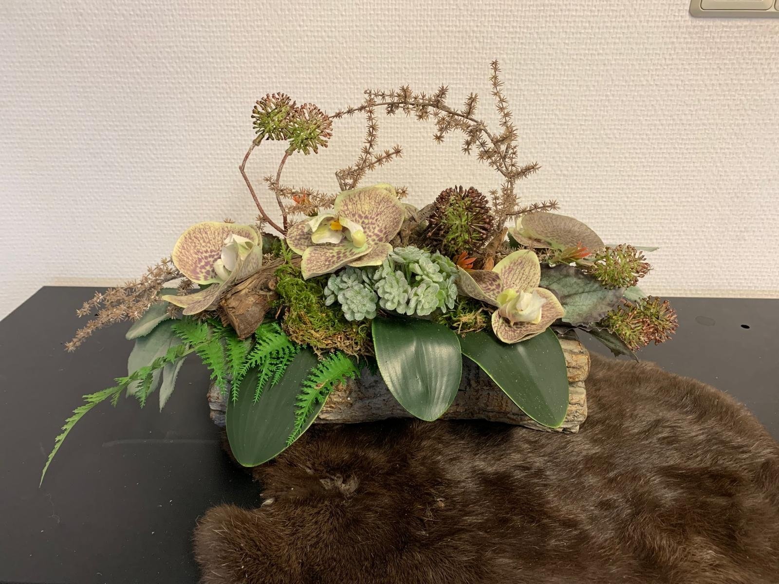 Dit bijzondere arrangement is opgebouwd op een natuurlijke houtbasis en combineert elegante orchideeën met diverse groene accenten en speelse takken. De combinatie van materialen zorgt voor een stoere en tegelijkertijd verfijnde uitstraling. Dankzij het gebruik van hoogwaardige kunstmaterialen is dit bloemstuk volledig onderhoudsvrij en blijft het langdurig mooi. Ideaal als uniek decoratiestuk op een tafel, kast of dressoir en perfect voor zowel thuis als op kantoor.