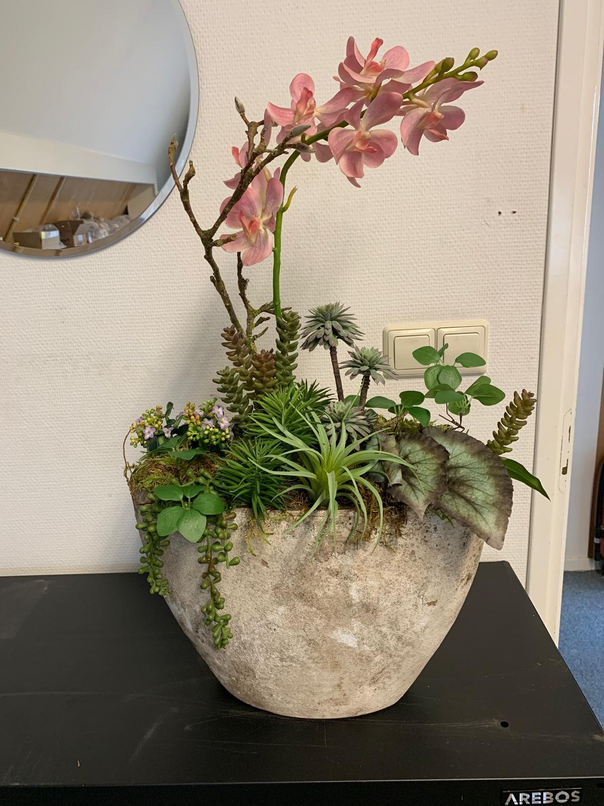 Stijlvolle vaas met orchidee, vetplanten en hangend groen. Een natuurlijke en onderhoudsarme blikvanger voor elk interieur.