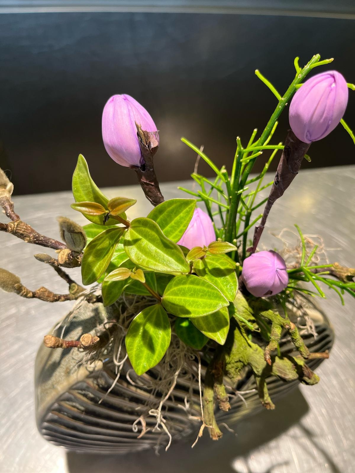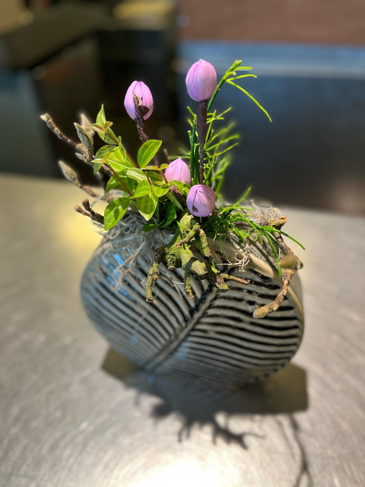 Voeg een speelse en moderne touch toe aan je interieur met dit prachtige zijden bloemstuk. De combinatie van paarse bloemknoppen, natuurlijke takken en levendig groen zorgt voor een frisse uitstraling. De opvallende zwart-witte sierpot met geometrisch patroon geeft het arrangement een eigentijdse en artistieke look. Perfect als eyecatcher op tafel, in de hal of op een kast. Onderhoudsvrij en altijd stijlvol.