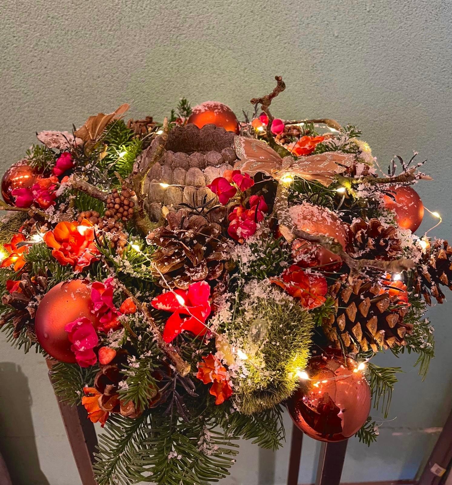 Kerststuk in rode tinten met waxinelichthouder en dennenappels.