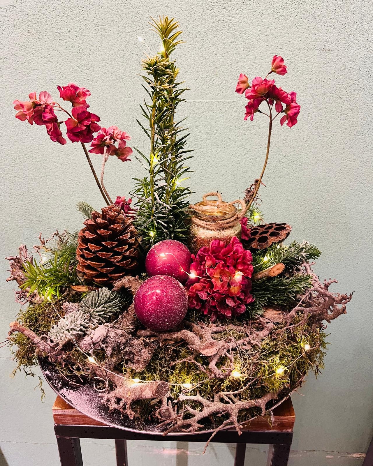 Dit ronde kerststuk met rode tinten brengt sfeer in ieder huis. Liever zonder lichtjes? Dat kan natuurlijk ook!