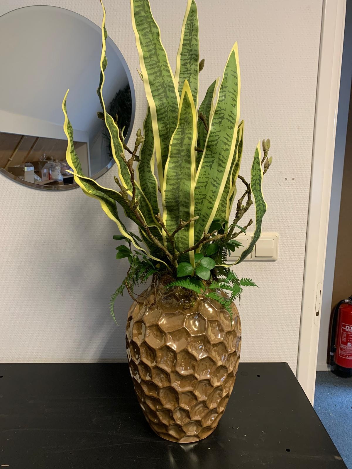 Stoer arrangement met sansevieria, takken en groen in een decoratieve vaas. Onderhoudsvrij en een echte blikvanger.