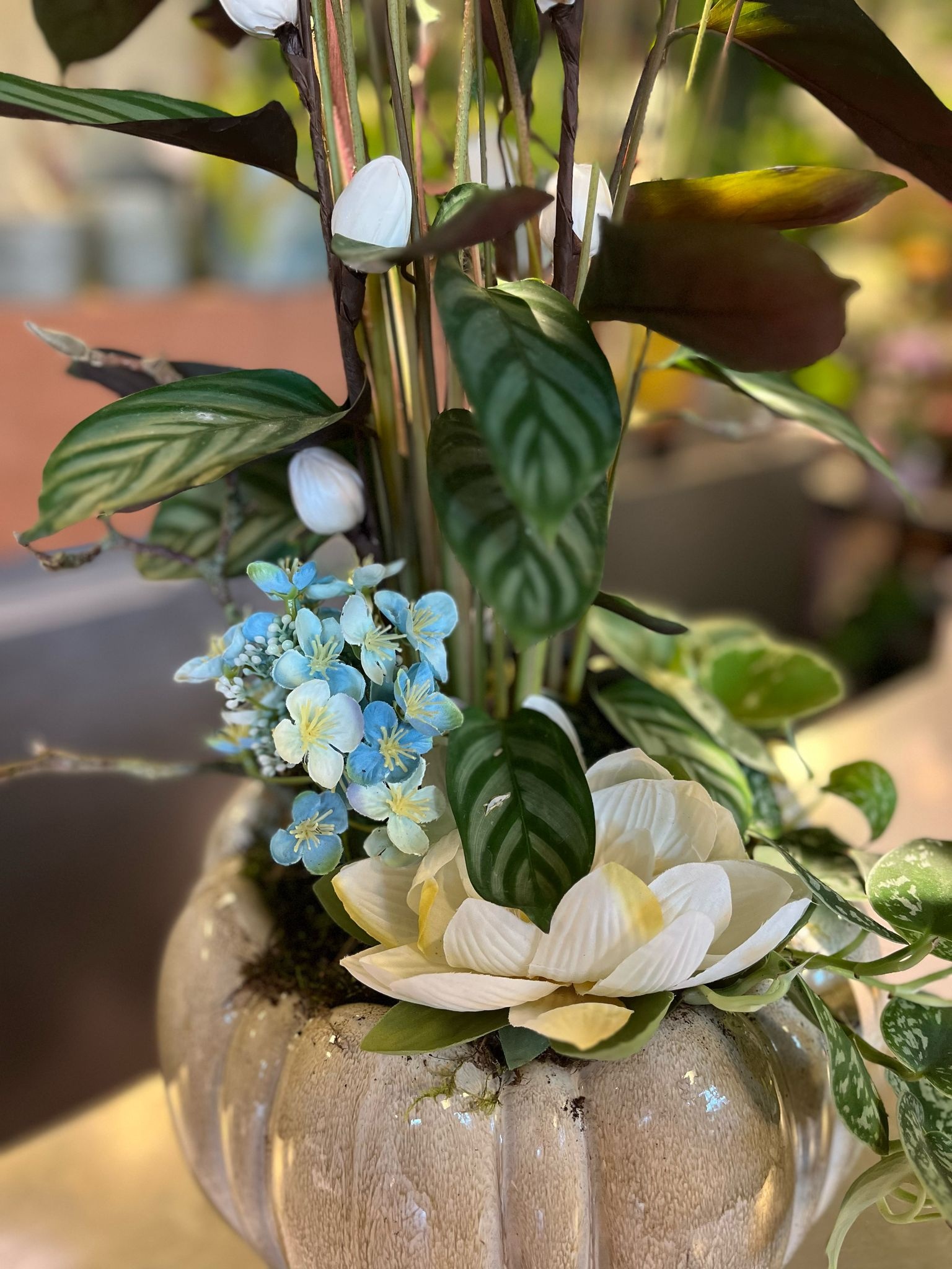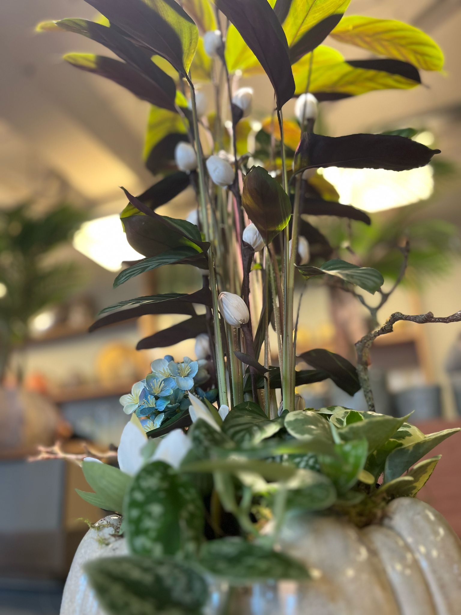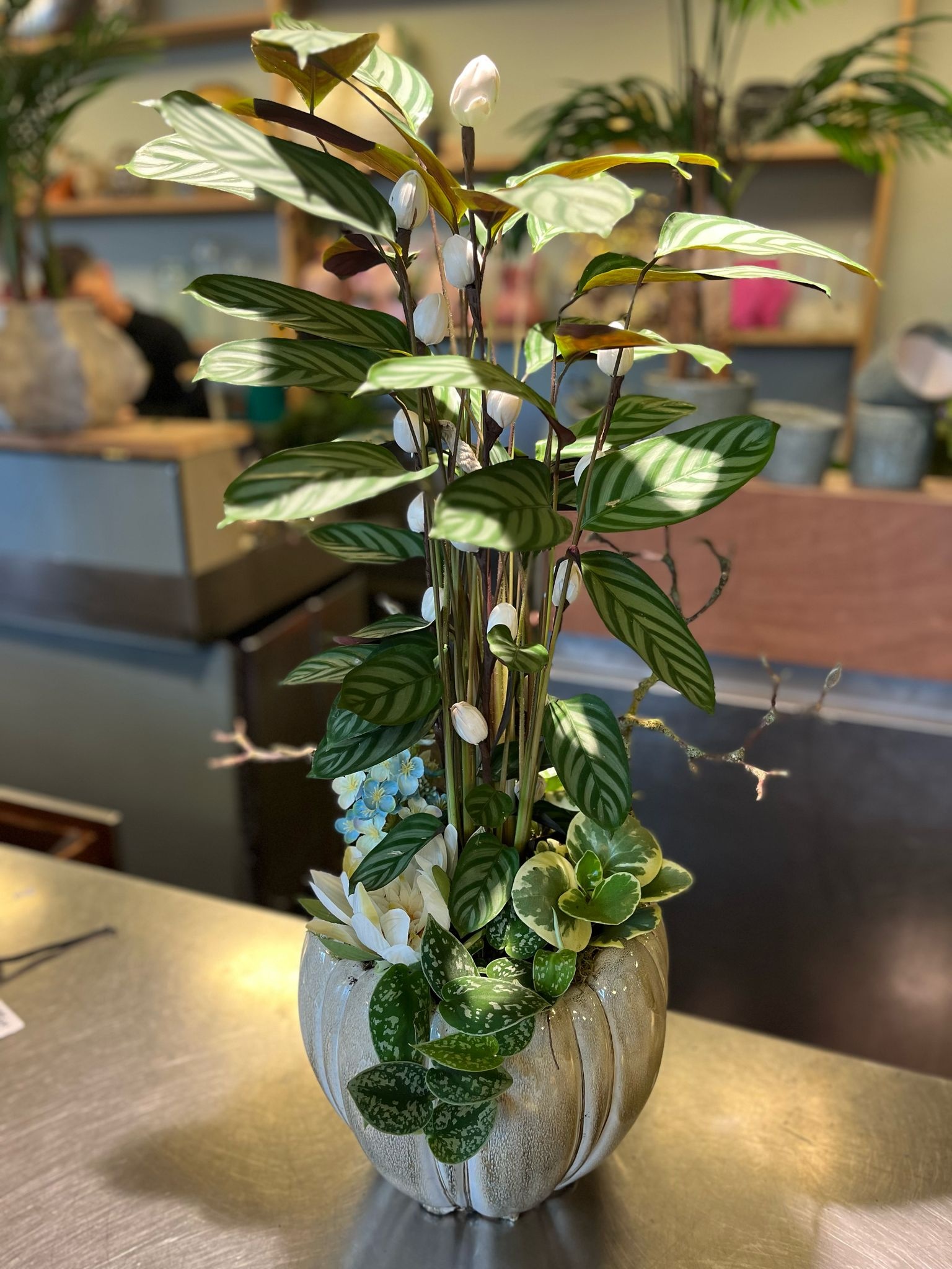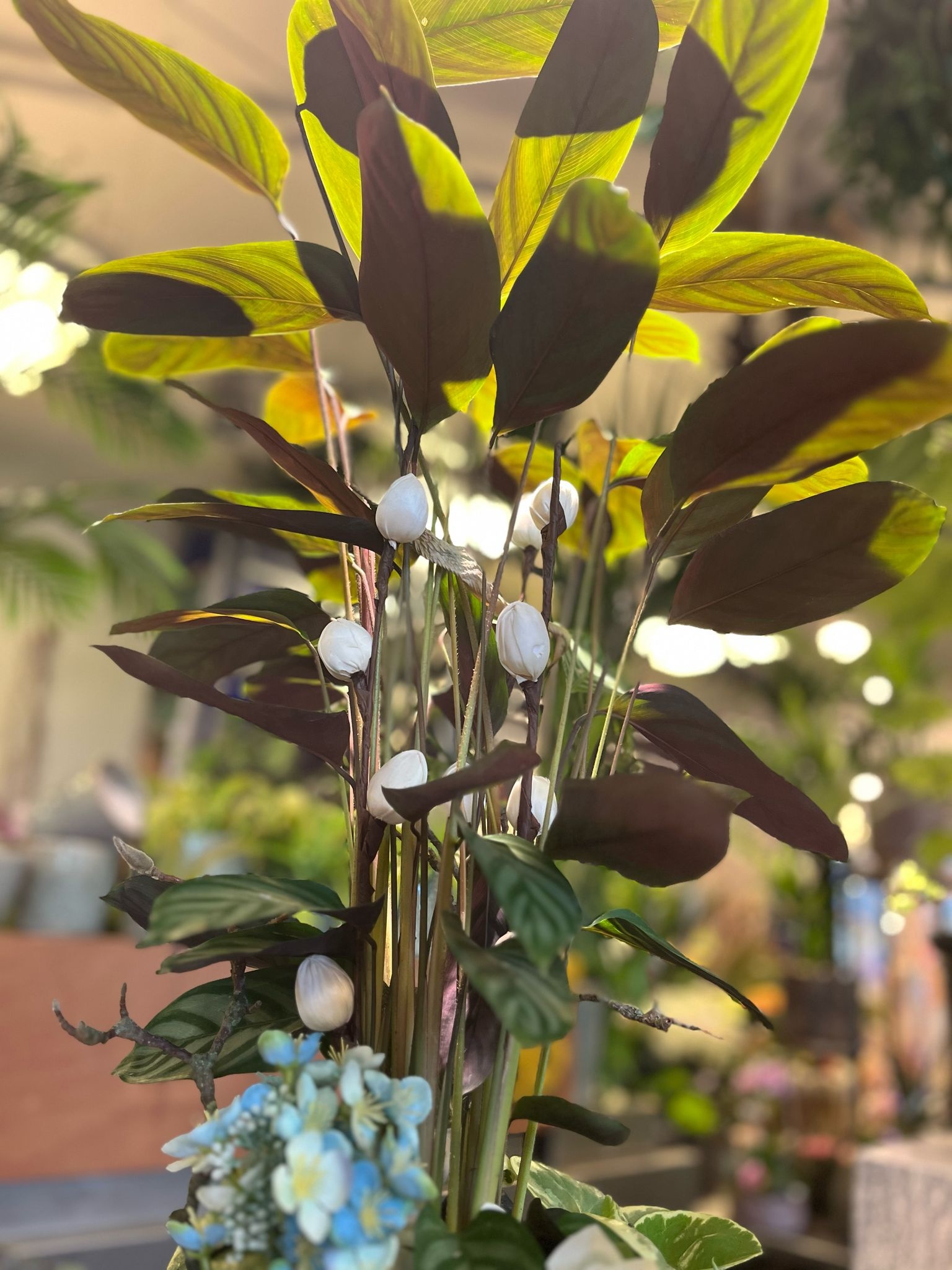 Dit stijlvolle zijden arrangement brengt een tropische sfeer in huis. Het speelse samenspel van gestreepte bladeren, witte bloemen en subtiele blauwe accenten creëert een levendig geheel. De glanzende keramieken pot voegt een luxe uitstraling toe en maakt het arrangement tot een echte blikvanger. Perfect voor in de woonkamer, hal of op kantoor. Volledig onderhoudsvrij en altijd stralend.