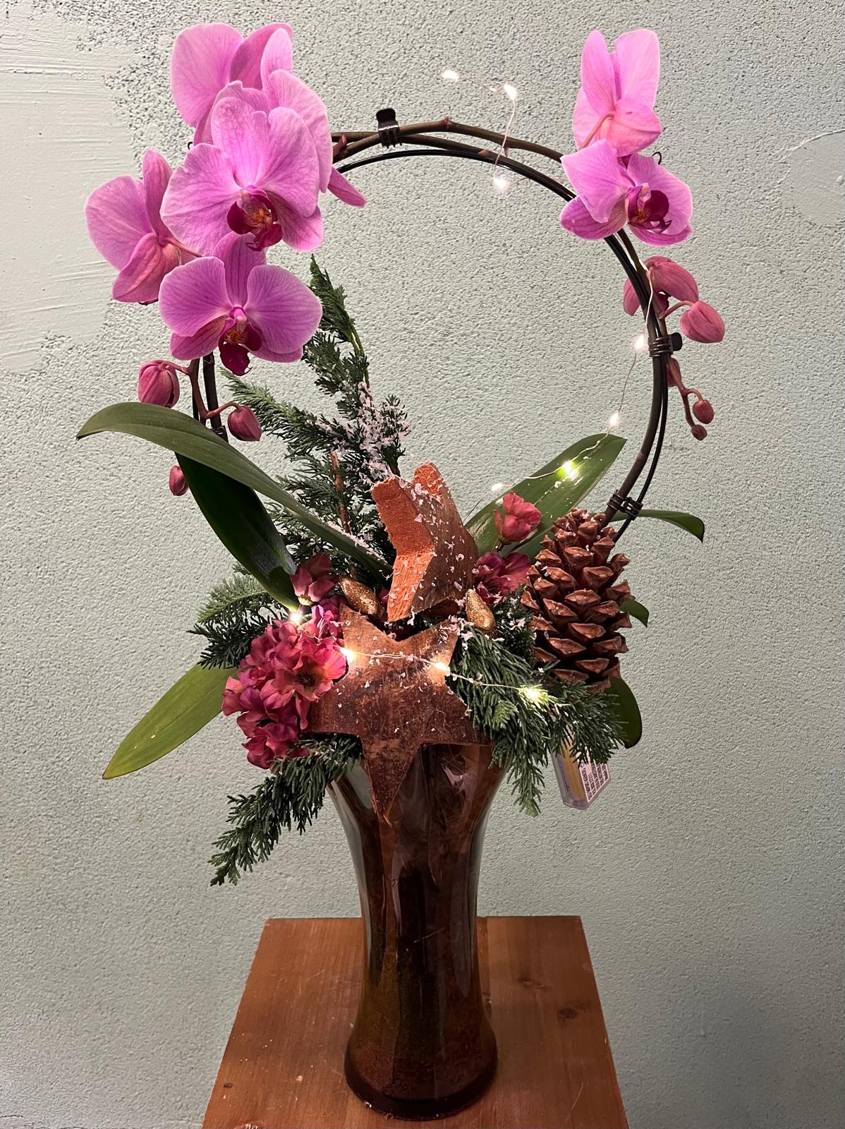 Dit creatieve kerststuk is een prachtstuk in huis. De ronde boog is versierd met roze orchidee, afgewerkt in een vaas met gezellige lichtjes. Liever zonder licht? Dat kan natuurlijk ook!