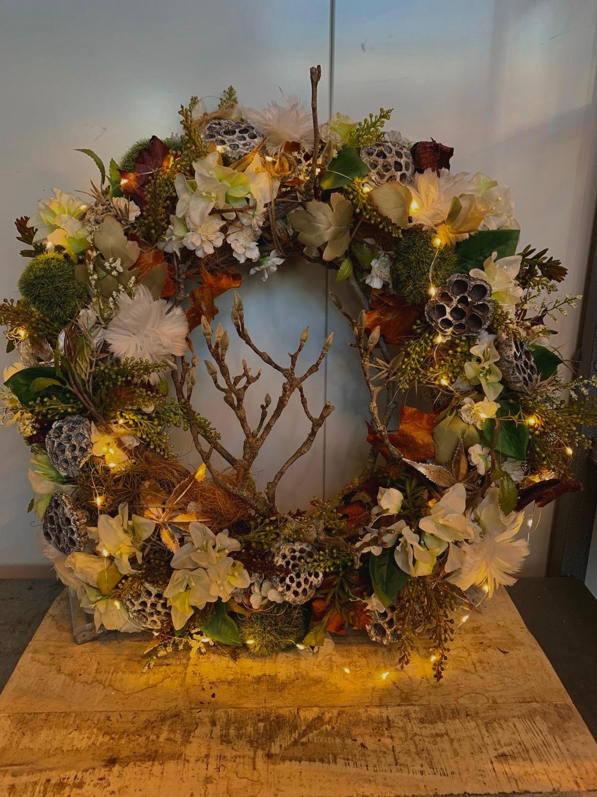De Winterse Lichtkrans, met witte bloemen, gedroogde lotuszaadkoppen en subtiele verlichting, straalt een serene wintersfeer uit. Perfect voor een sfeervol accent aan deur of muur tijdens de feestdagen.