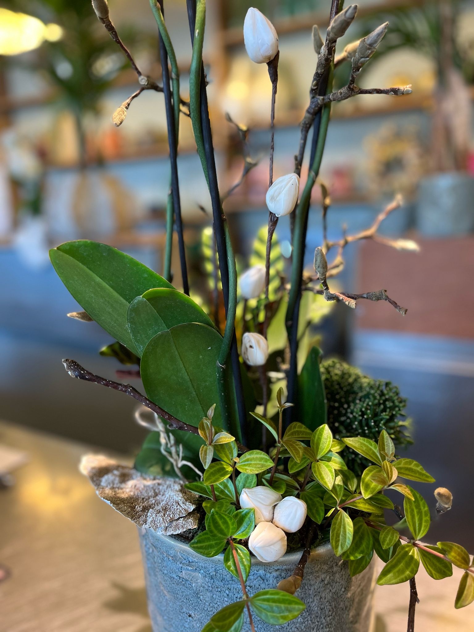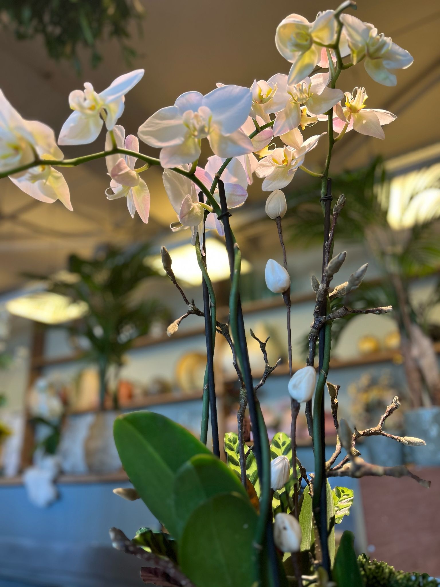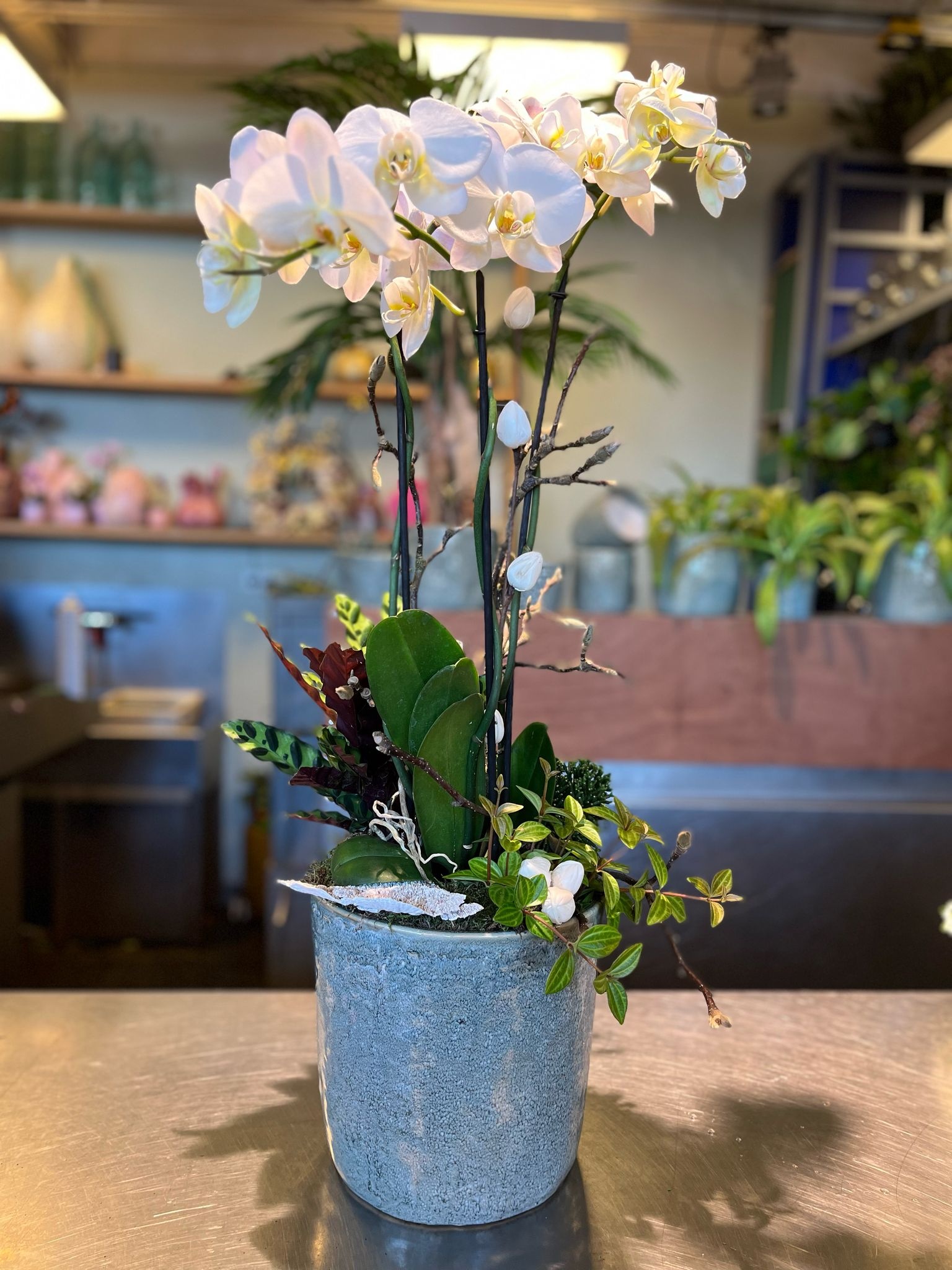 Breng een vleugje elegantie in huis met deze prachtige witte orchidee, gepresenteerd in een robuuste blauwe keramieken pot. De levendige bloemen in combinatie met groene bladeren en speelse takken zorgen voor een frisse en natuurlijke uitstraling. De stevige pot geeft het geheel een moderne touch en maakt het arrangement perfect voor op tafel, in de hal of op kantoor. Met een hoogte van 90 cm is dit een echte blikvanger die sfeer toevoegt aan elke ruimte.