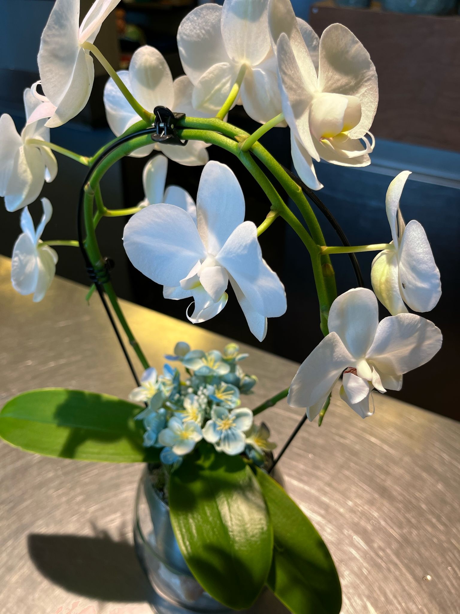 Voeg een stijlvolle touch toe aan je interieur met deze prachtige witte orchidee in een transparante glazen vaas. De sierlijke bloemstelen vormen een elegante boog en worden gecombineerd met subtiele blauwe bloemen en sierstenen voor een verfijnde uitstraling. De glazen vaas zorgt voor een luchtige, moderne look en laat de decoratieve details mooi uitkomen. Perfect voor op een tafel, dressoir of bureau.