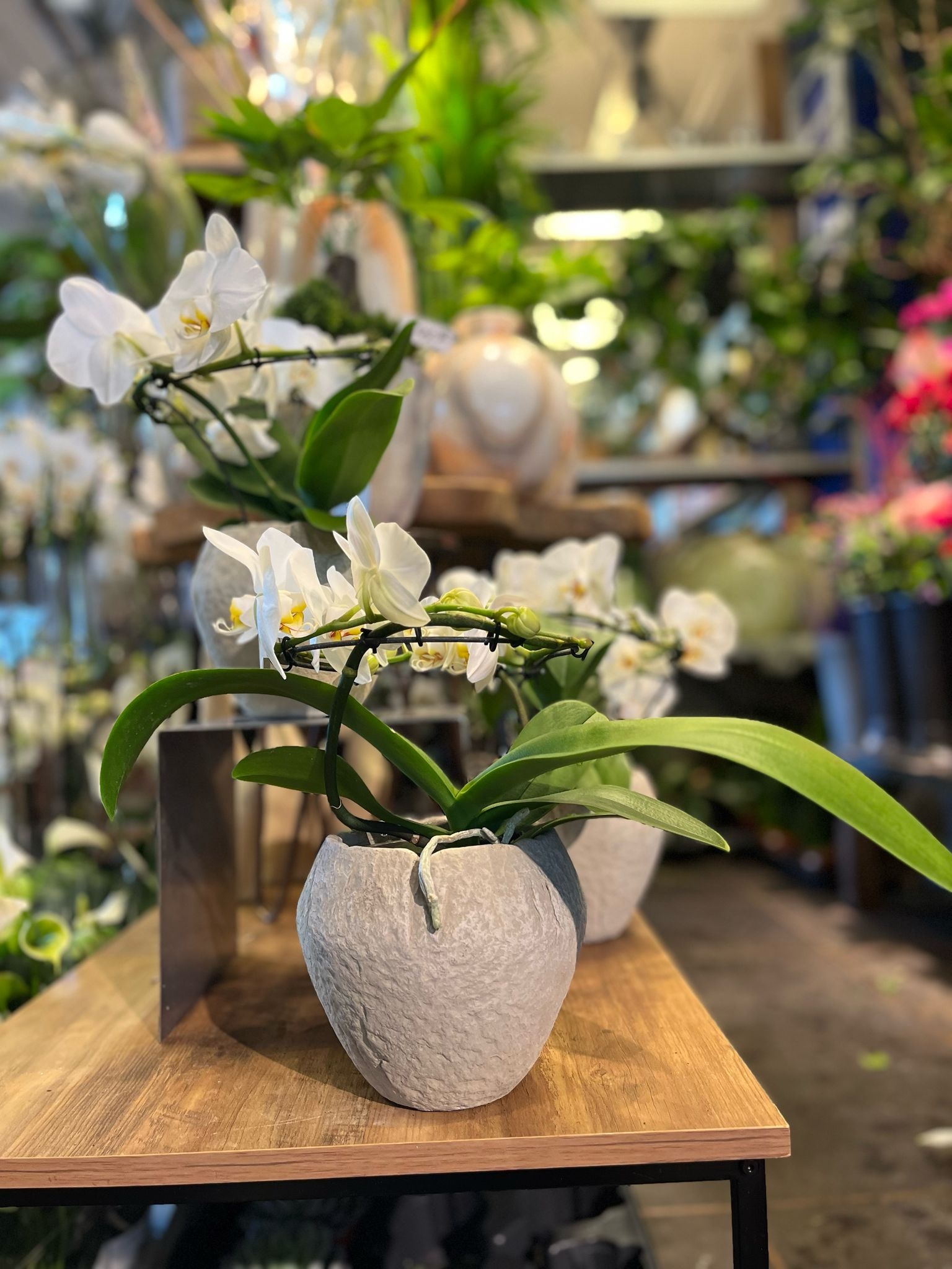 Compact wit orchidee arrangement van 30 cm hoog in een rustieke grijze sierpot. Elegant, onderhoudsvrij en geschikt voor elk interieur.