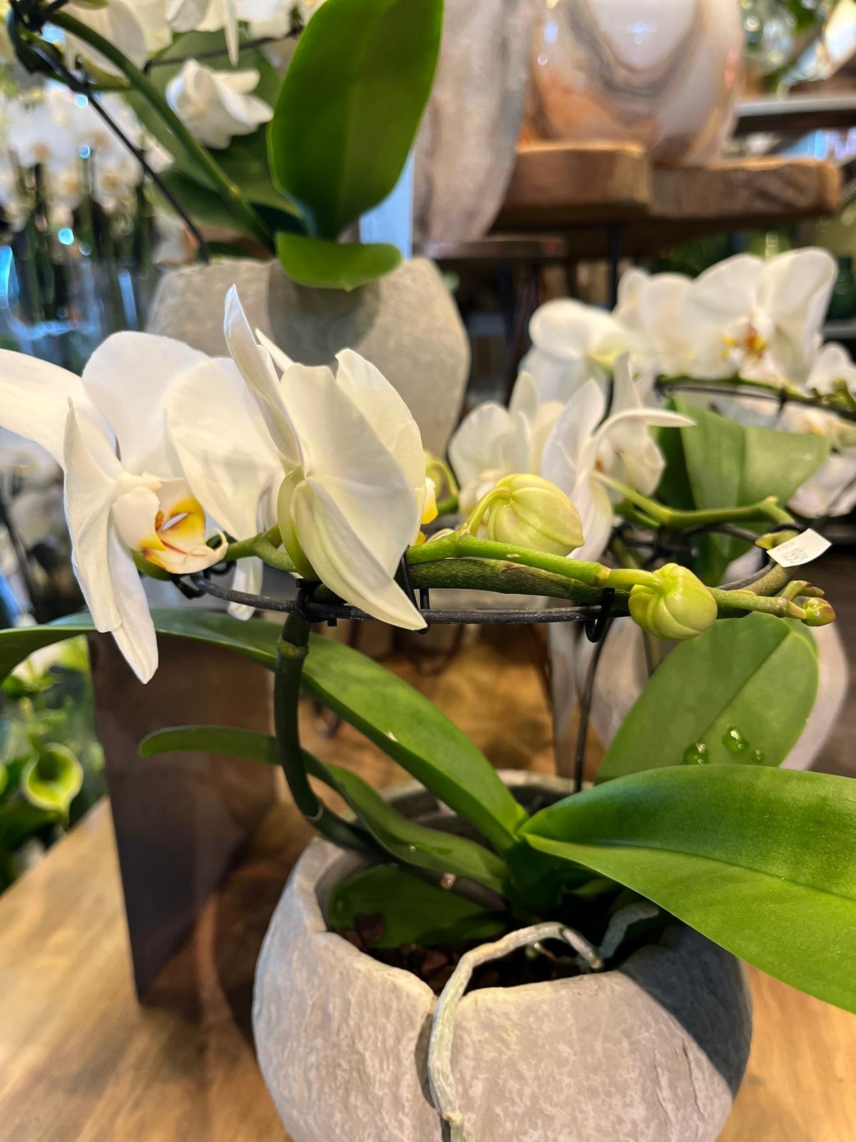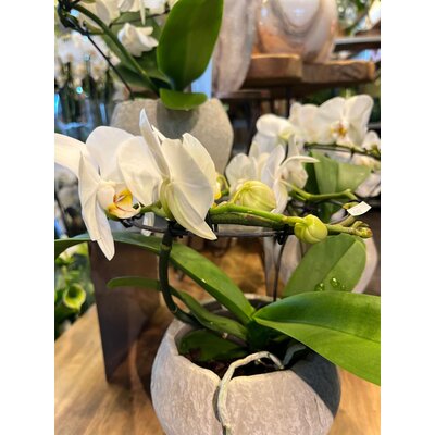Breng een vleugje elegantie in huis met deze prachtige witte orchidee in een robuuste, rustieke sierpot. De speelse boog van de bloemstengel en de helderwitte bloemetjes zorgen voor een frisse, stijlvolle uitstraling. De grijze pot met natuurlijke textuur geeft het geheel een moderne, maar warme look. Ideaal voor in de woonkamer, op een bureau of als stijlvol cadeau. Onderhoudsvrij en altijd stralend.